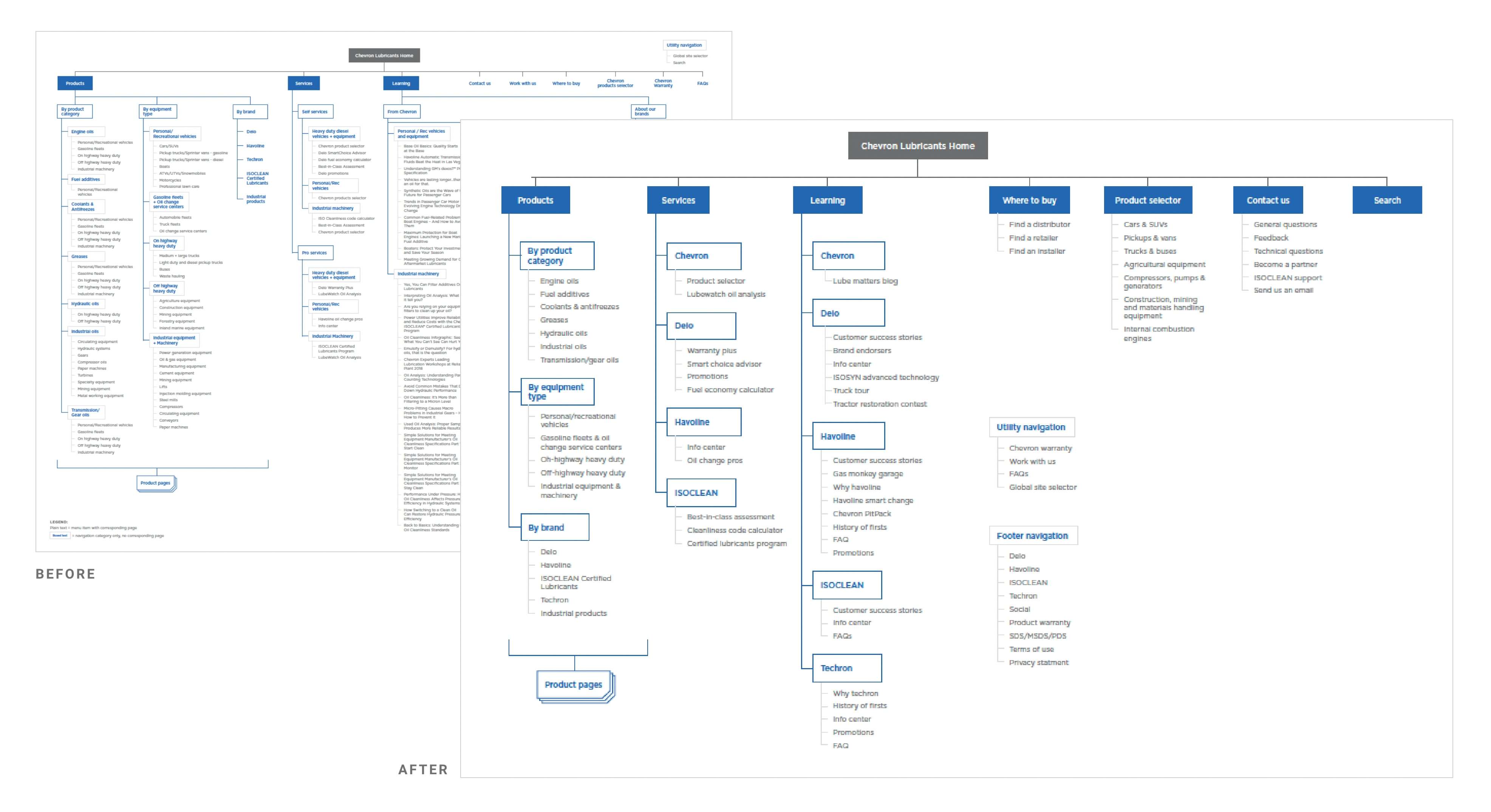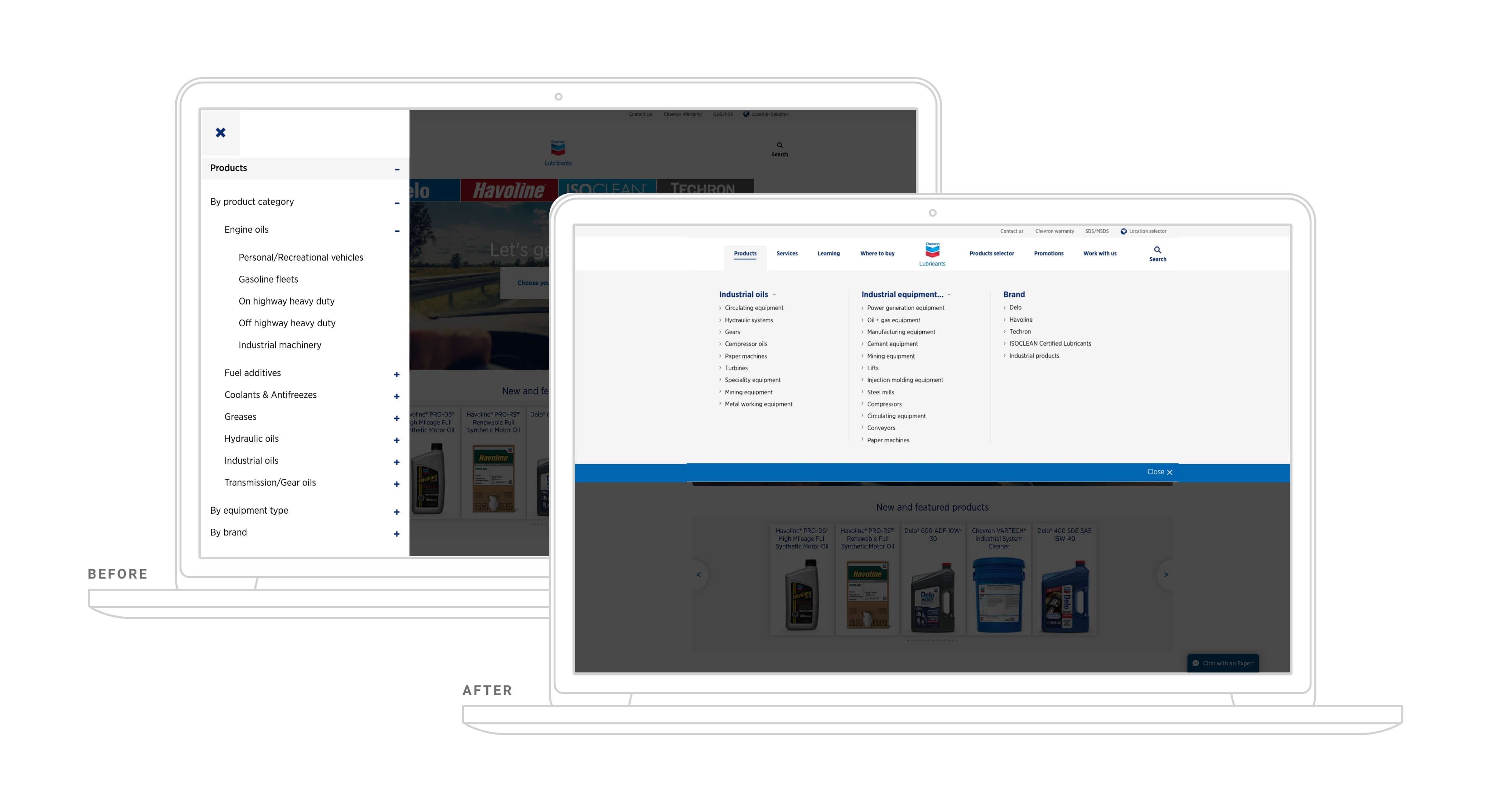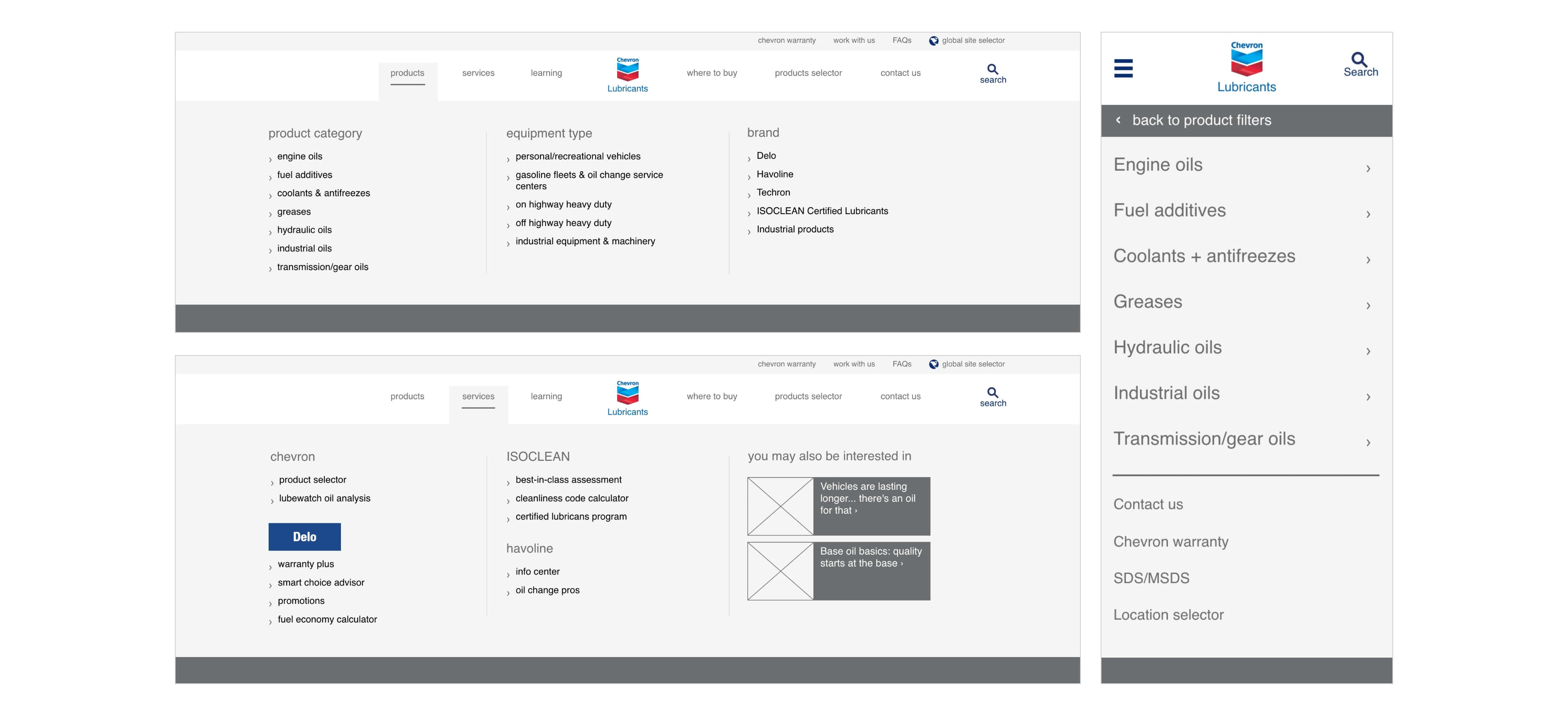 Chevron's original navigation solution contained four layers of information, 83 links in one dropdown alone, inconsistent heading designs, duplicate links, and an left-hand-side menu, all hidden behind a hamburger icon on tablet and desktop devices that reduced discoverability.