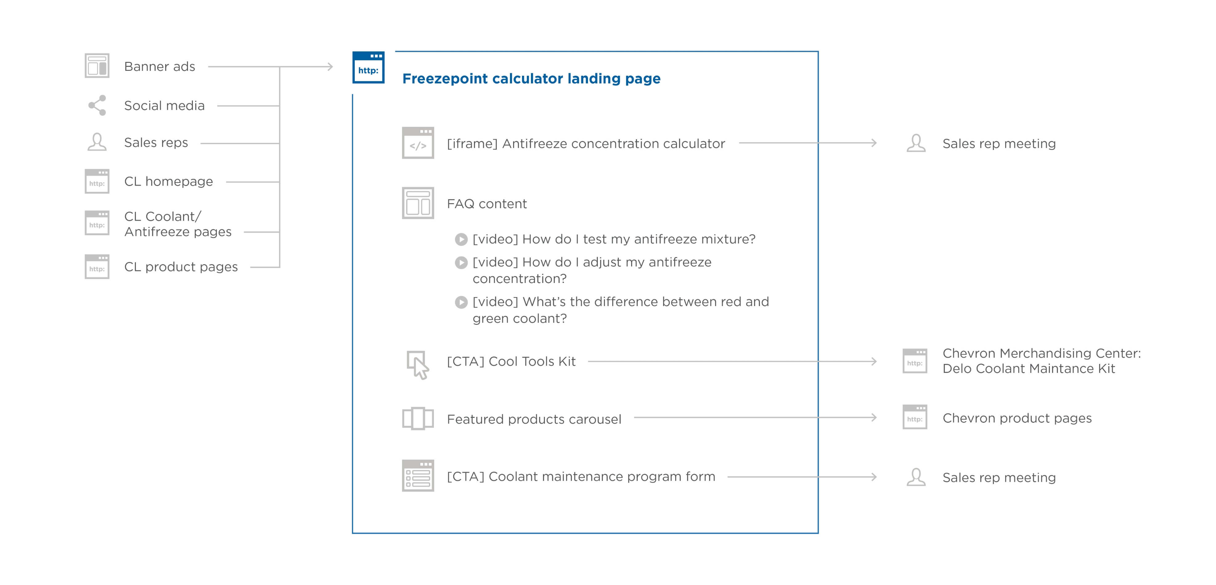 Before jumping into user flows, we needed to understand the ecosystem in which the tool resided in order to craft a consistent experience across all touchpoints, eliminate repetetiveness, and ensure the tool delivered what the messaging said it would. In stakeholder interviews, I uncovered the business goals and the larger persuasion strategy intended to lead a prospect from awareness to purchase that enabled me to create a tool that both helps the user while providing marketing value for Chevron. The first step was mapping the ecosystem.