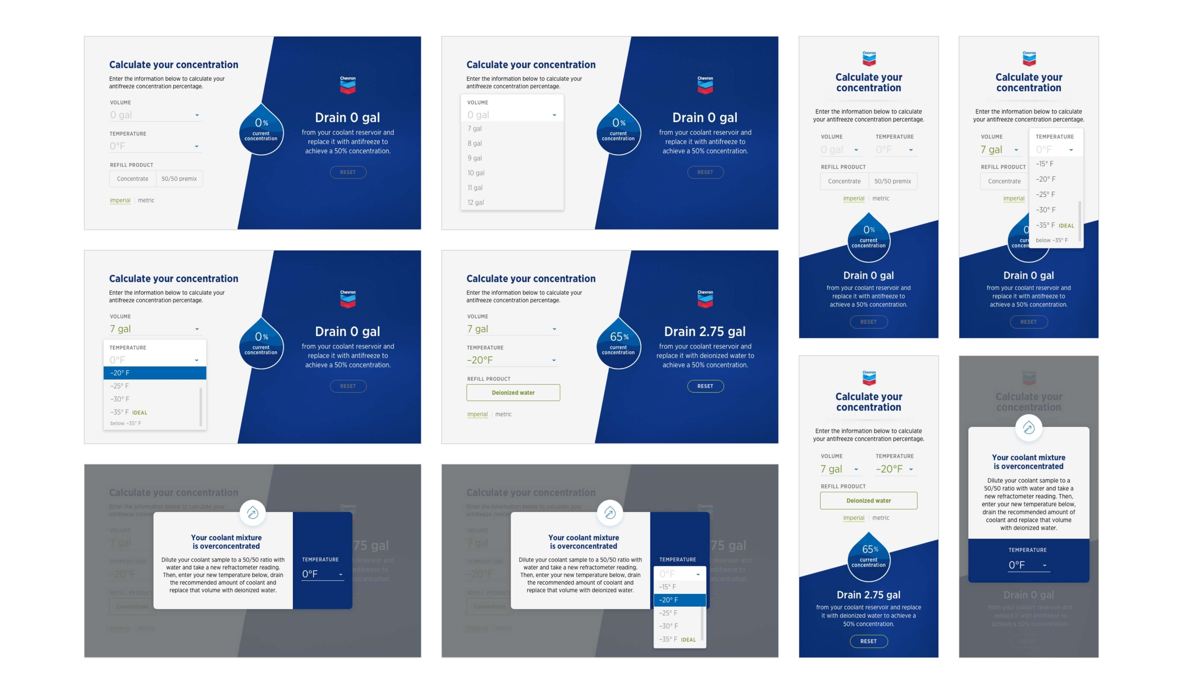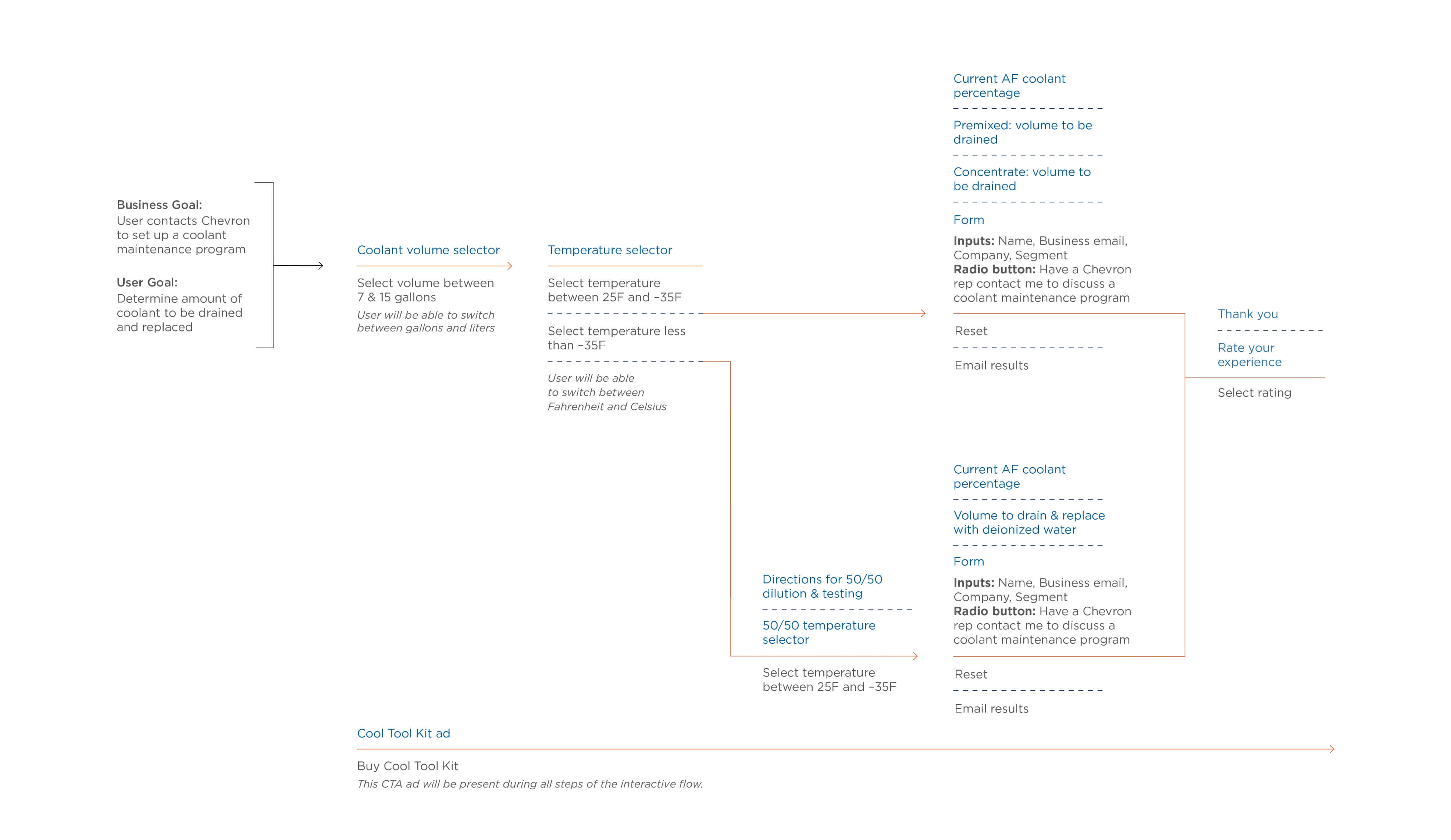 Equipped with the business goals the tool was a part of accomplishing, I then interviewed Chevron's subject matter expert to learn the logistics, motivations, and pain points surrounding the typical experience operators have when checking and adjusting their antifreeze concentration and moved on to creating a user flow.