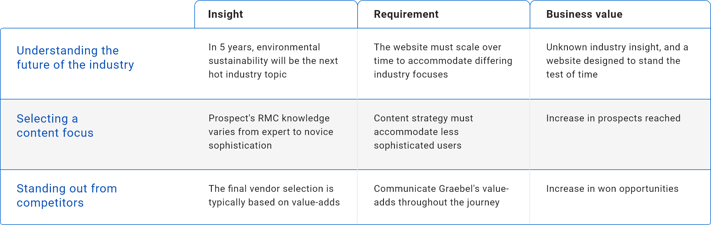 Our team uncovered a number of new insights we were able to report back to Graebel that had real business value including new industry insights, ways to ensure an increase in prospects reached as well as ways to win more business. Here are just a few: