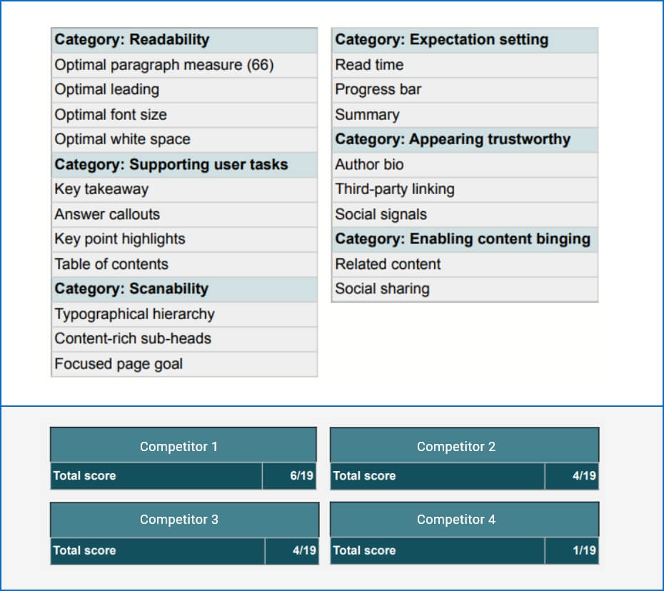 One of the most prevalent jobs throughout the buying process for users is to perform one-to-one comparisons of potential vendors. Often times, a prospect's own job can rely on selecting the right vendor and so the pressure is high. As one of those vendors, understanding your relative position to competitors across multiple dimensions is valuable for communicating and demonstrating superiority. The UX Competitive Audit had the following objectives: