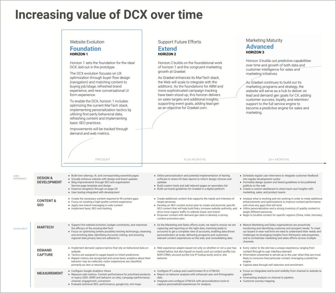 With the completion of the vision prototype and supporting strategies required to enable the vision, our team worked collaboratively to combine everything into a detailed implementation manual. Starting with our vision prototype, the team worked backwards to develop a roadmap for Graebel to make incremental and bite-sized progress towards the vision.