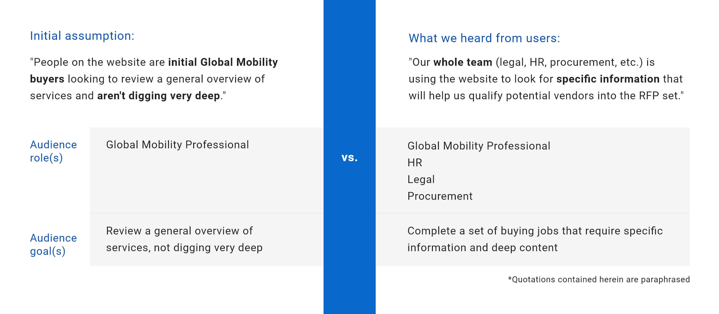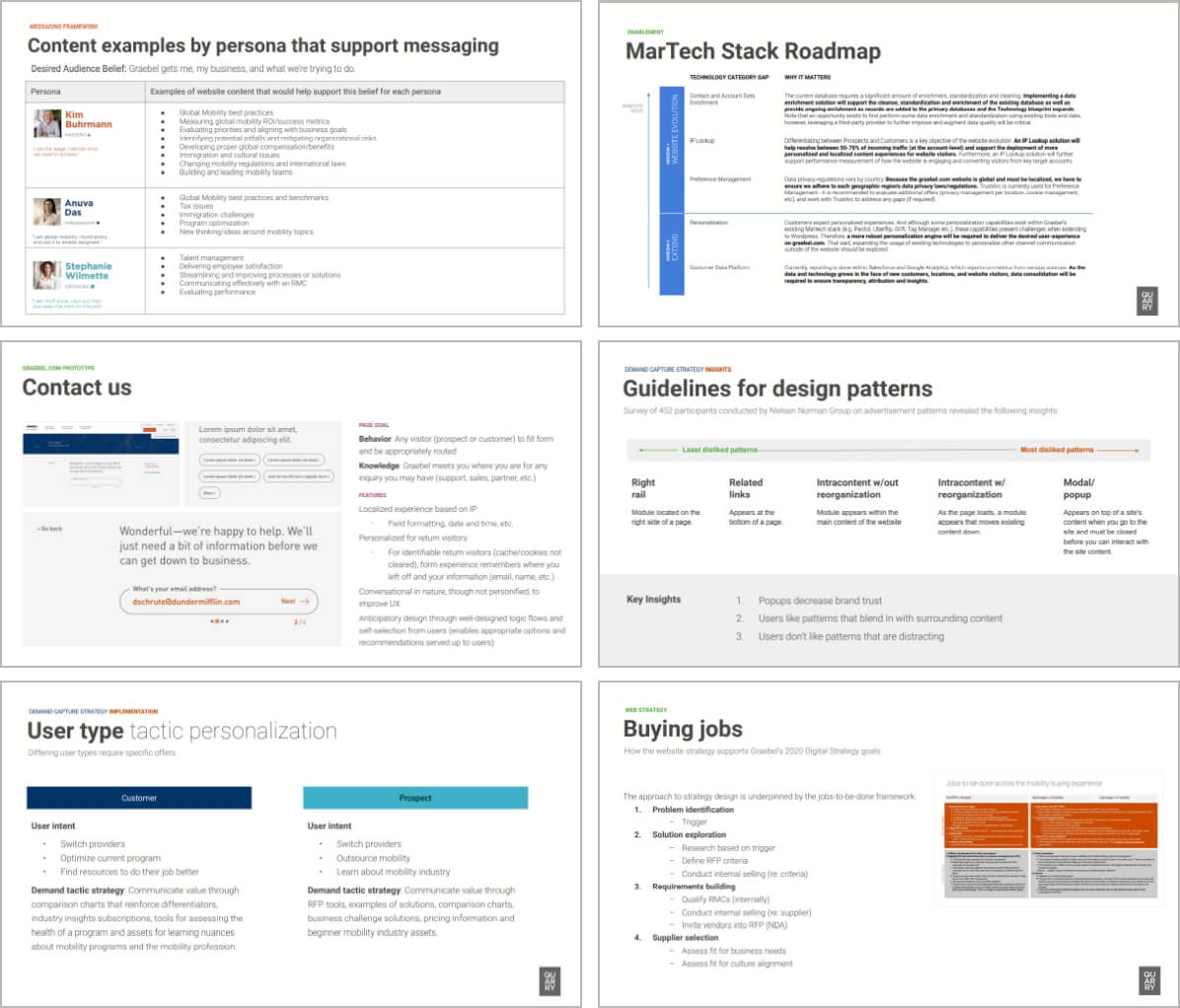 Graebel is exceptionally in tune with their customers, but a few inconsistencies were identified between stakeholder assumptions and real customer feedback. Taking these inconsistencies back to Graebel to discuss their implications resulted in strategic direction changes they weren't expecting, but were delighted to find— deepening their affinity for the human-centred design process.