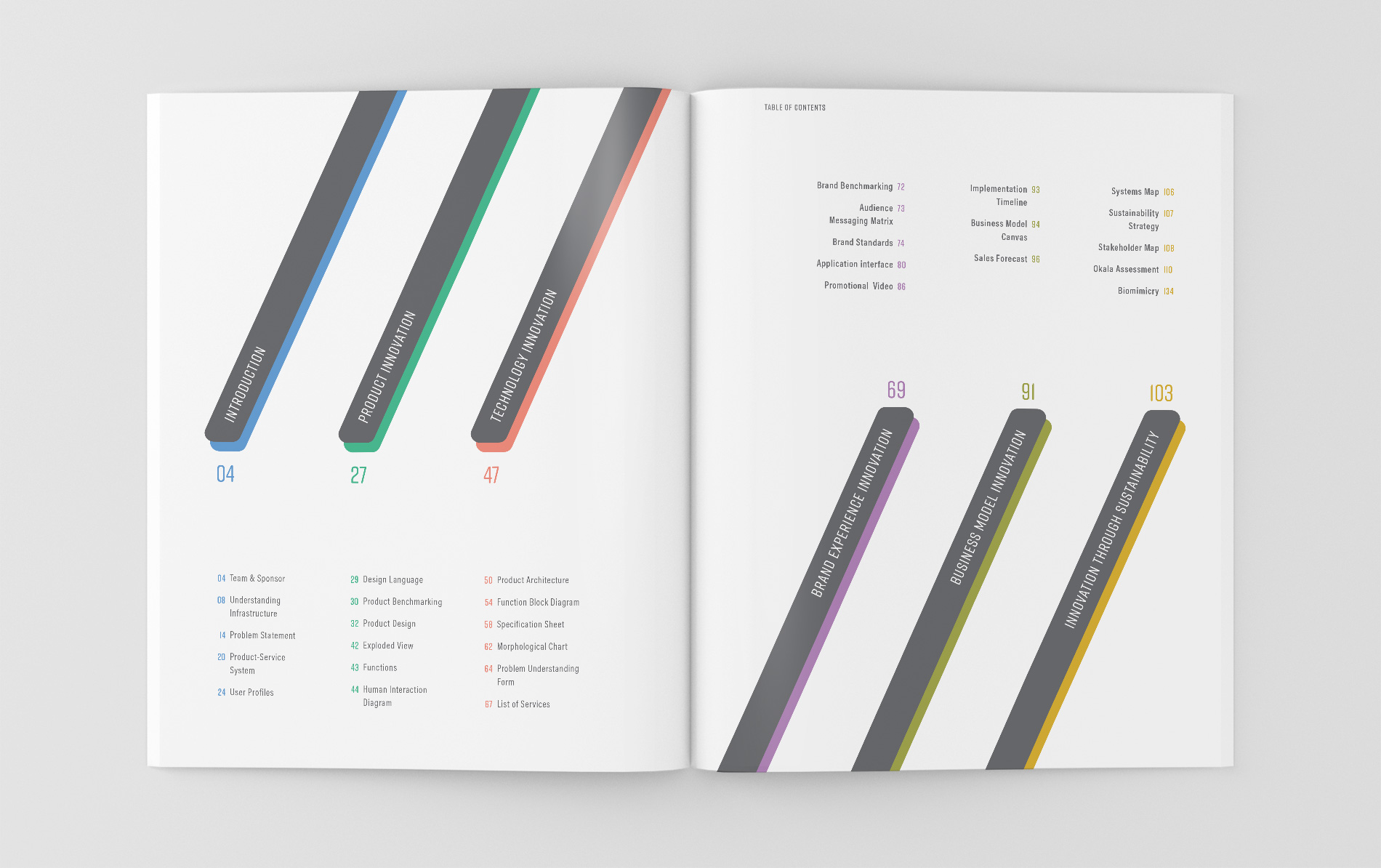 Each team member was responsible for the materials in his/her respective discipline. In order to present this plethora of material, a proposal was designed to incorporate all deliverables. The following images are snippets of a 143 page book that details understanding the problem, product innovation, technology innovation, brand experience innovation, business innovation, and sustainability innovation.